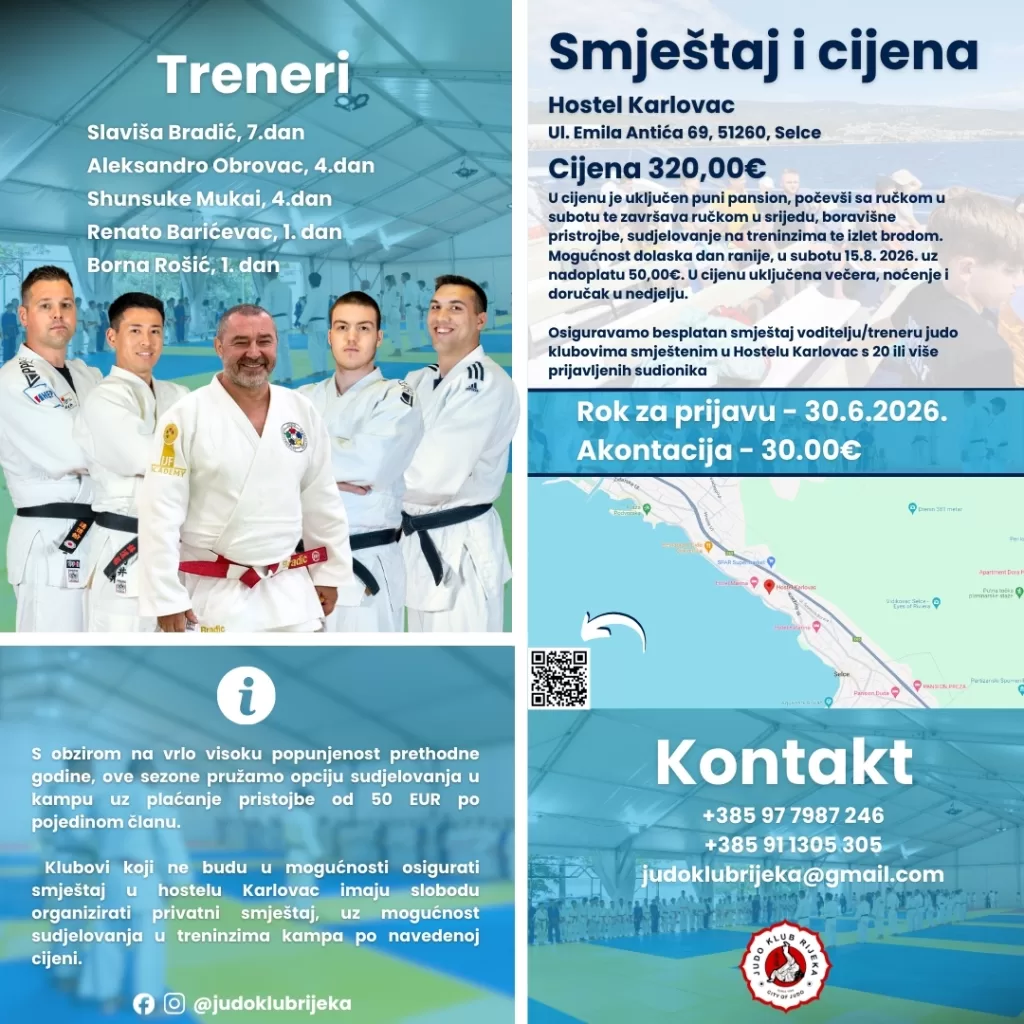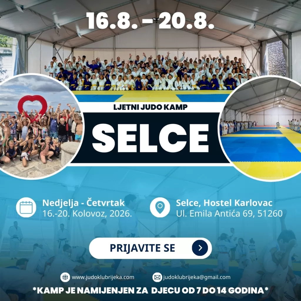 Judo klub Rijeka s velikim veseljem najavljuje povratak tradicionalnog ljetnog Judo kampa “Selce”, koji će se ove godine održati od subote, 16. kolovoza do srijede, 20. kolovoza 2026. godine.